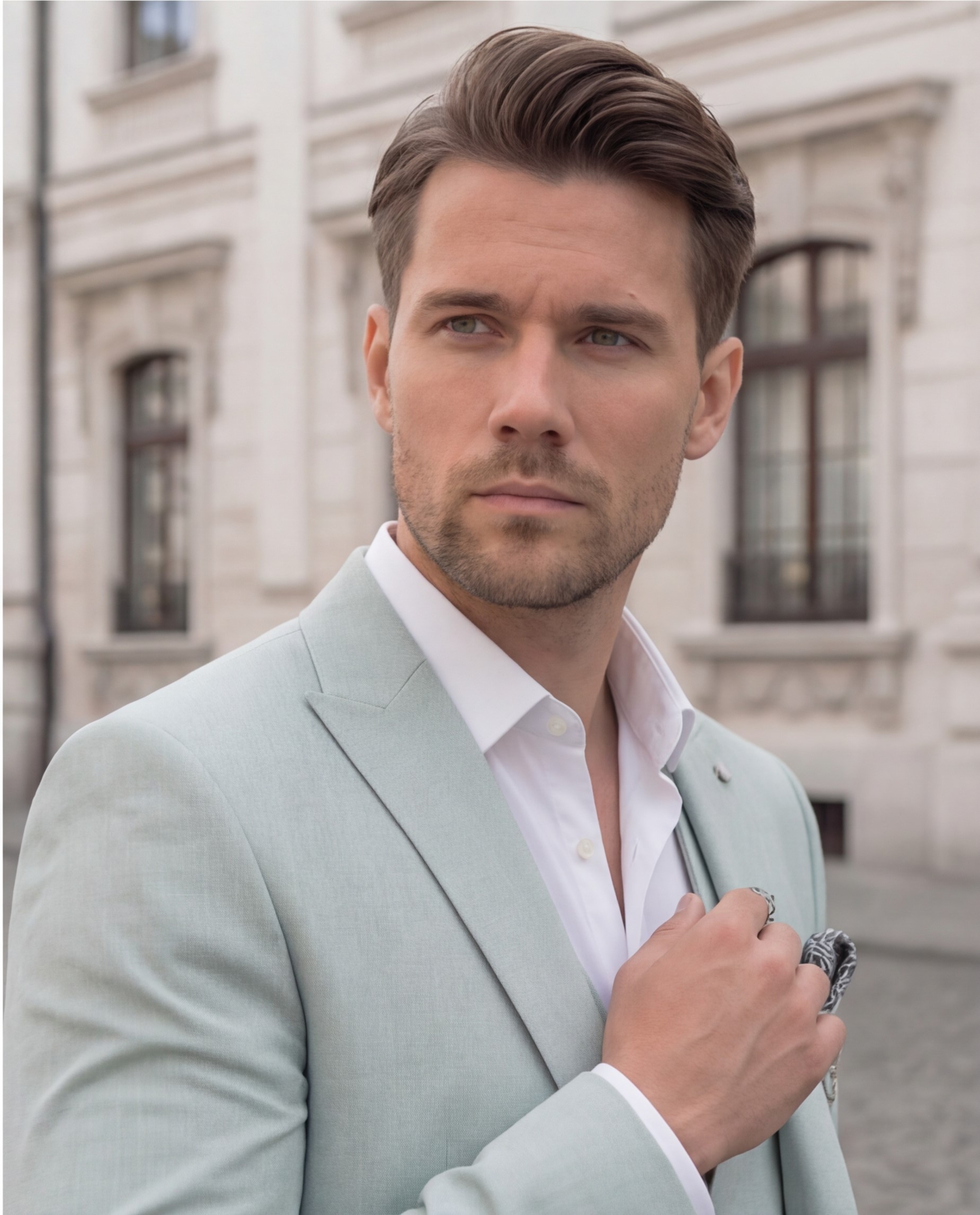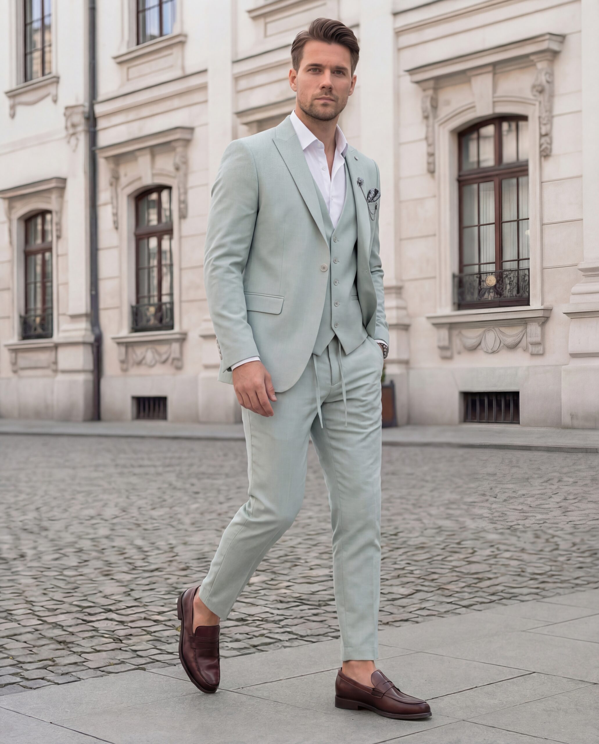 חליפת פשתן בצבע ירוק מנטה, מעוצבת ומדויקת.