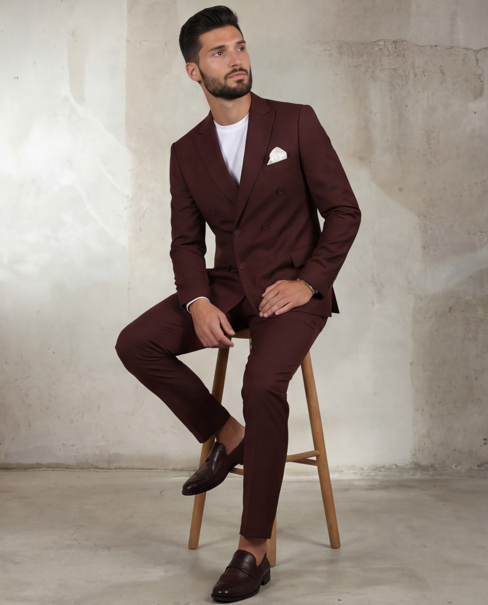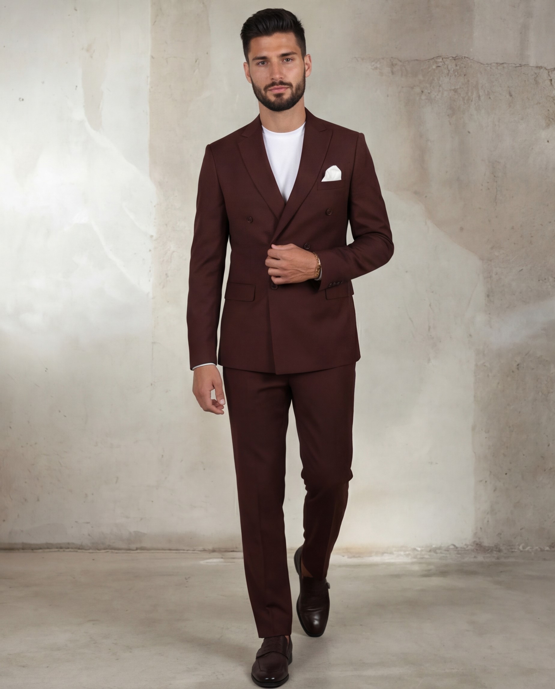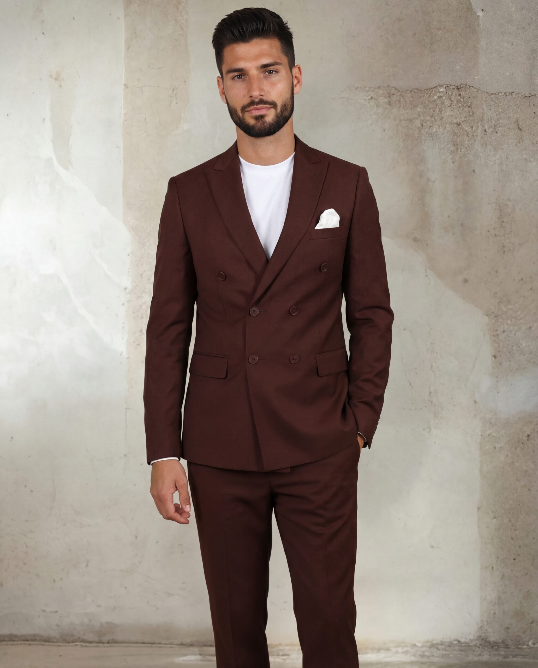 חליפת דאבל ברסטד בגוון חום שוקולד עמוק – הבחירה למי שמחפש לוק מחויט, עוצמתי ושונה מהשחור והכחול הרגילים.