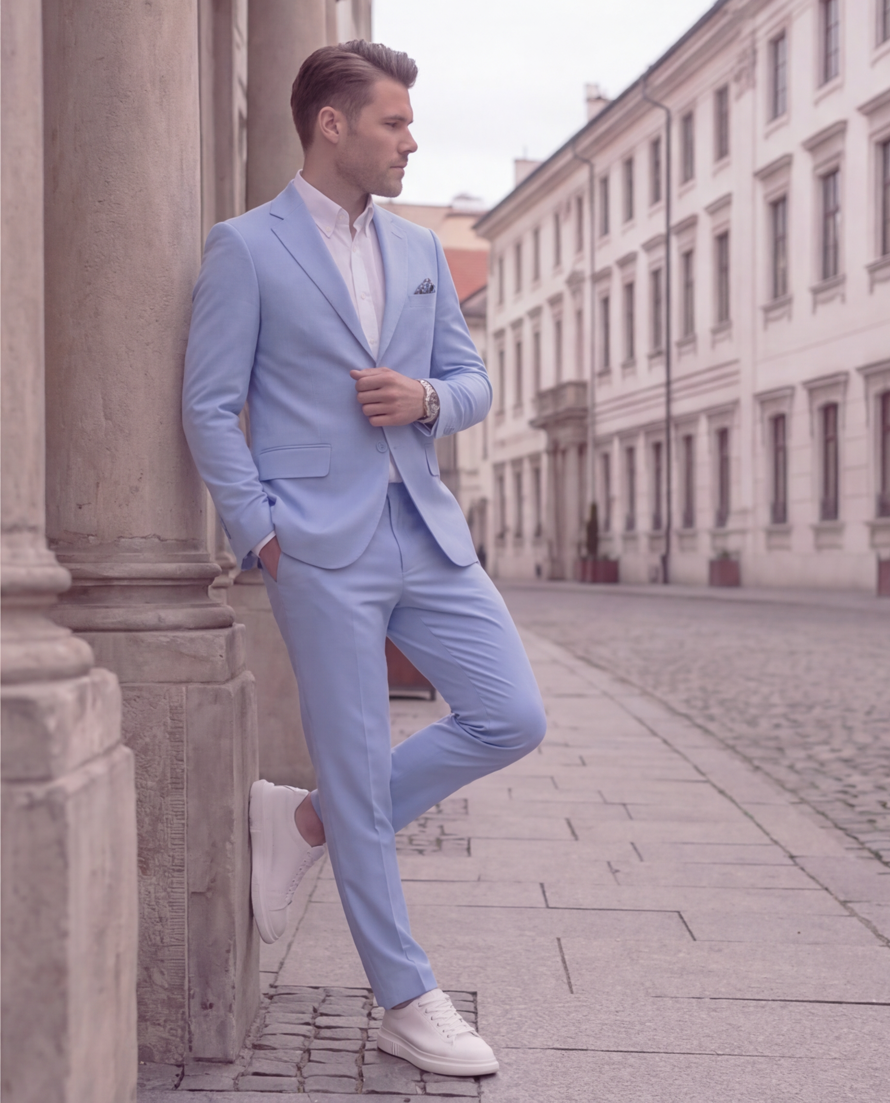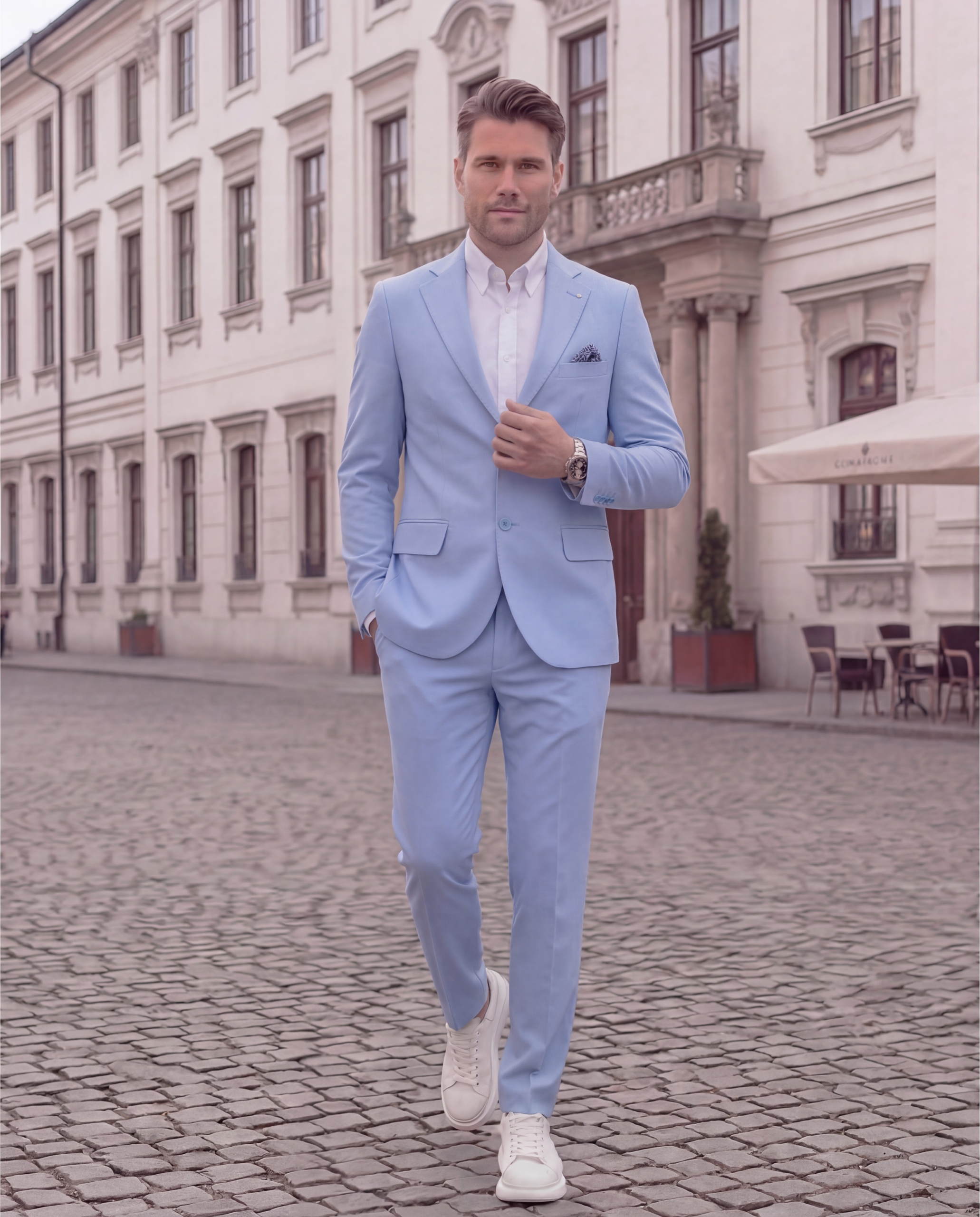 חליפה בצבע תכלת, מעוצבת ומדויקת.